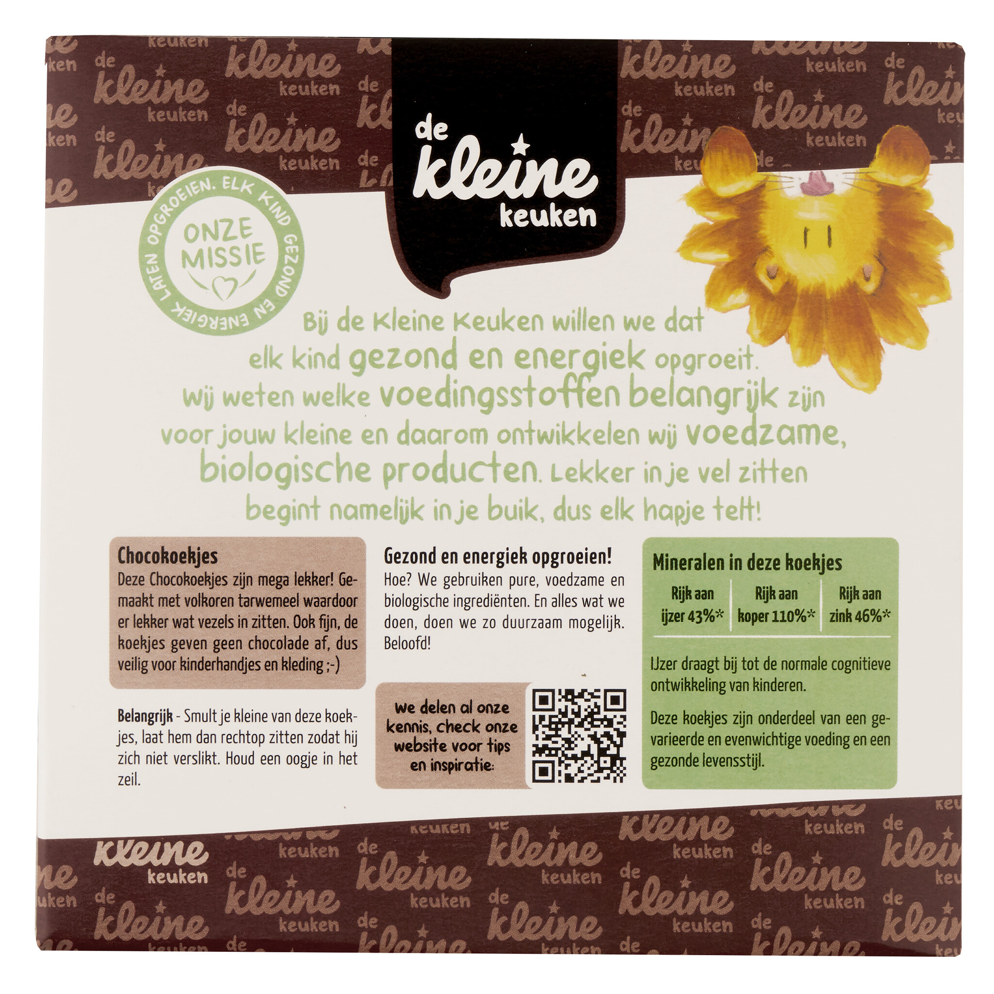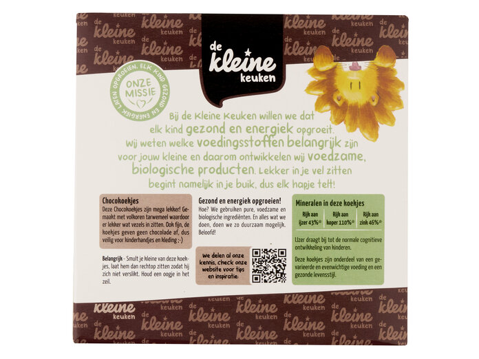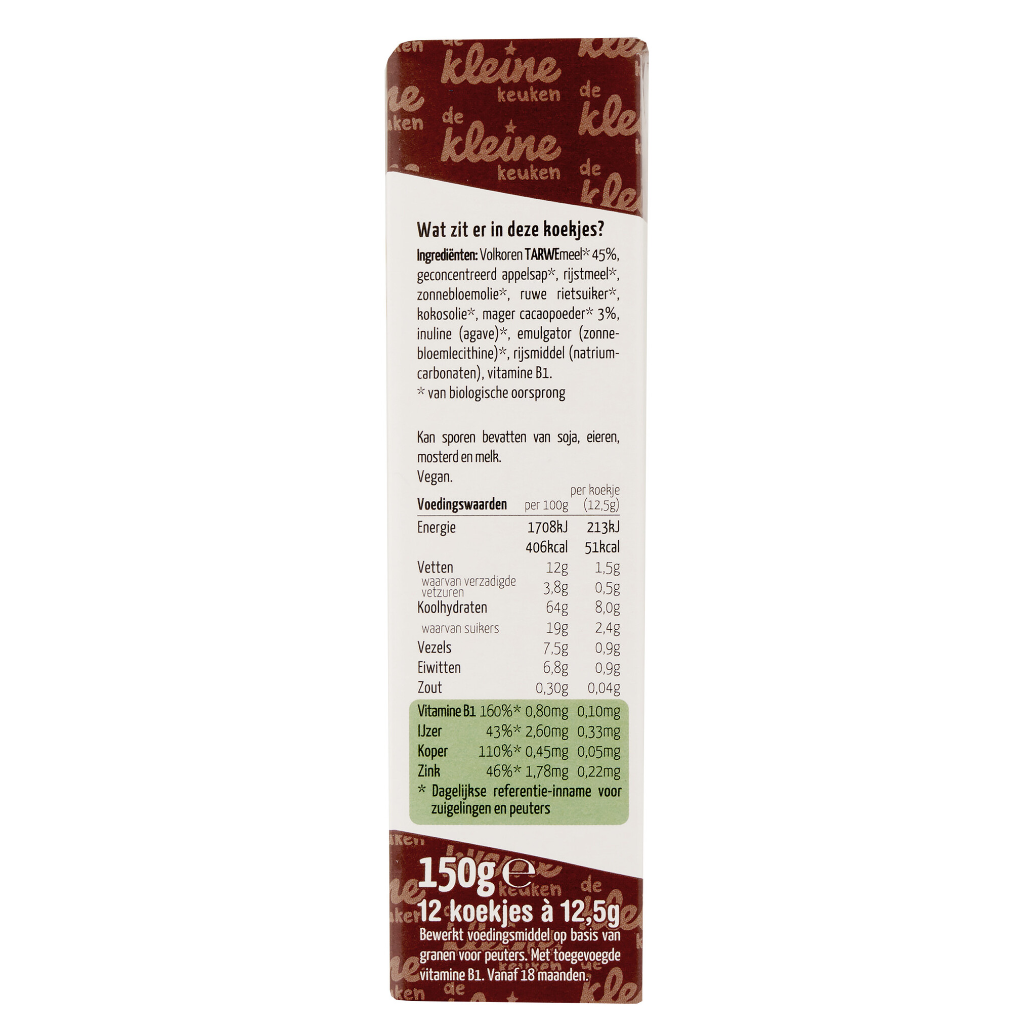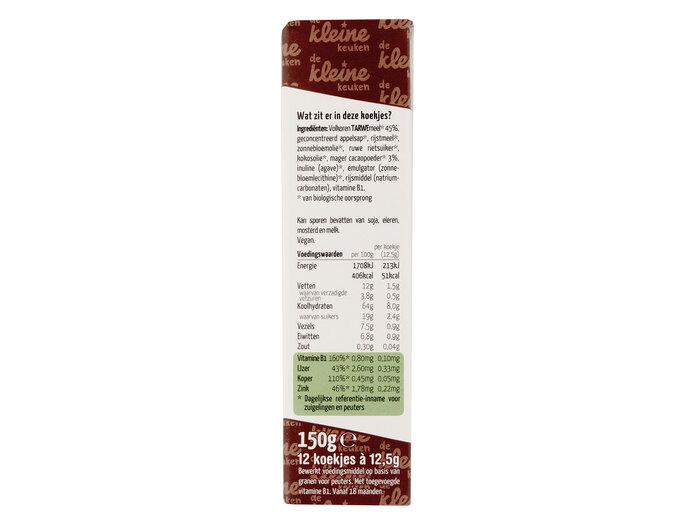 Vollkorn-WEIZENmehl* 45 %, konzentrierter Apfelsaft*, Reismehl*, Sonnenblumenöl*, Rohrzucker, Kakaopulver* 3 %, Kokosöl*, Inulin*, Emulgator (Sonnenblumenlecithin)*, Vitamin B1, Backtriebmittel (Natriumbicarbonat).