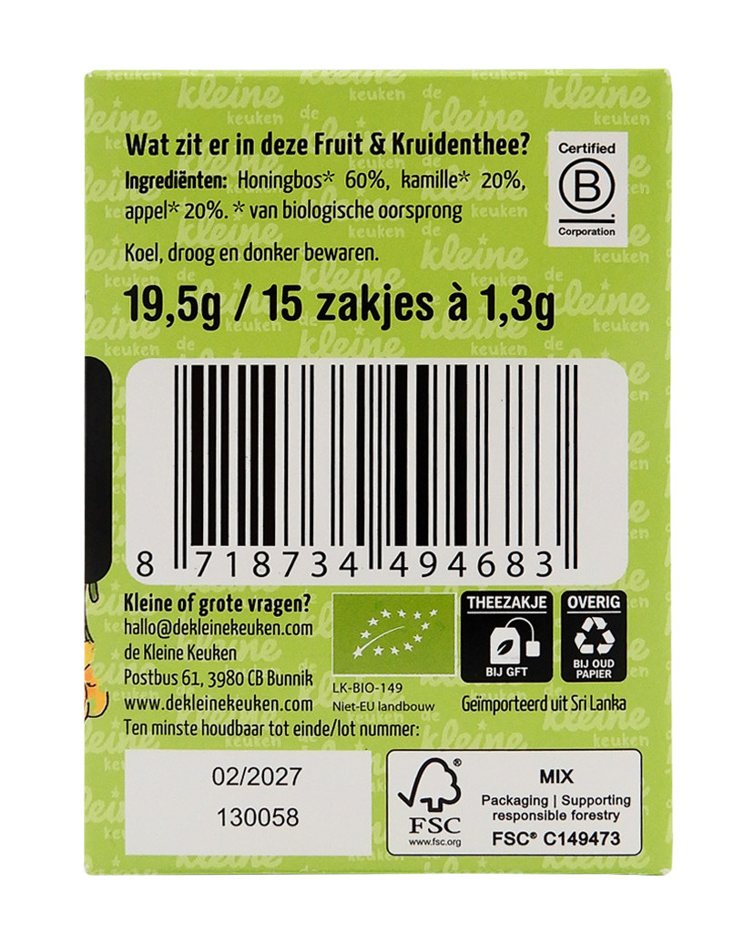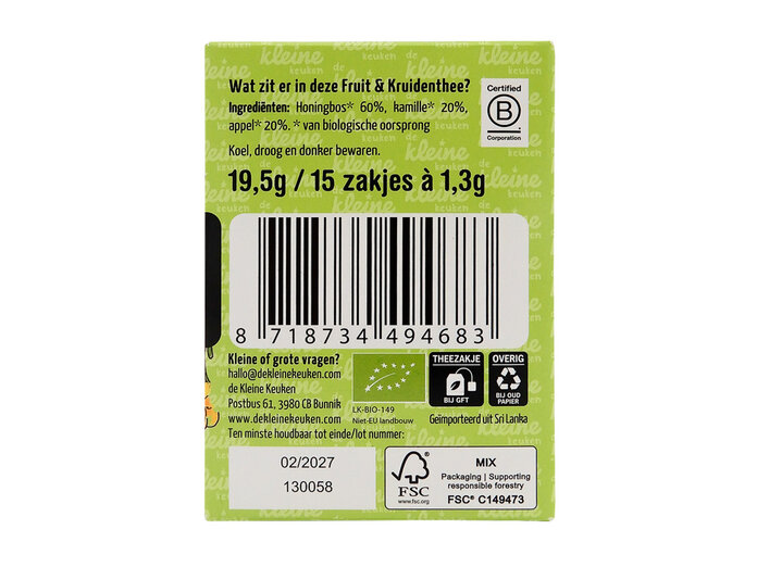 Honigbusch* 60%, Kamille* 20%, Apfel* 20%.