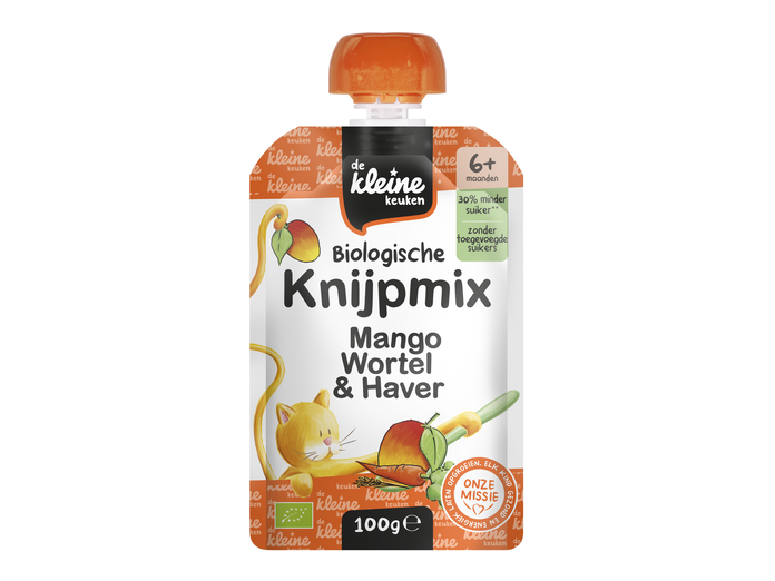 Karottenpüree* 78%, Mangopüree* 10%, Apfelpüree* 9%, glutenfreies Vollkorn-HAFERmehl* 2%, konzentrierter Zitronensaft.